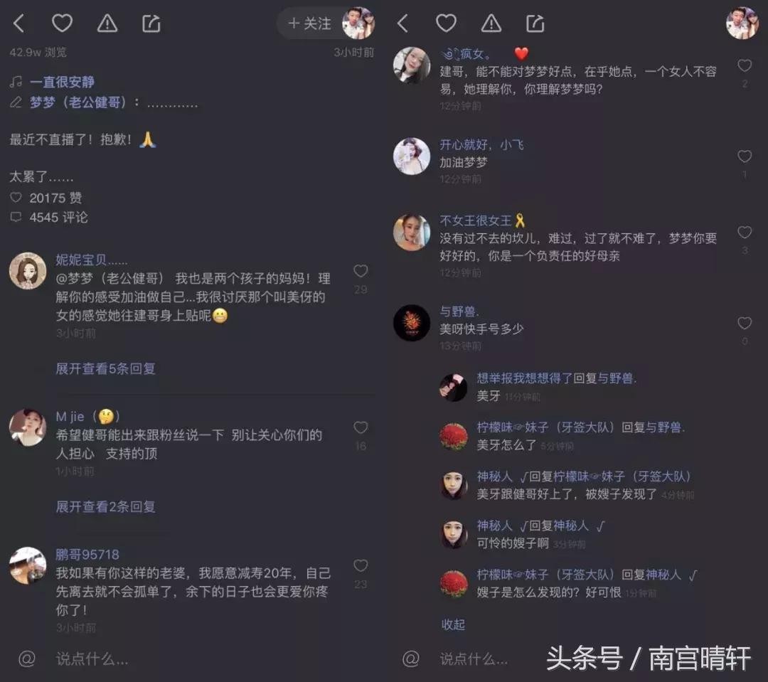 随后某女主播发文直指健哥,说找男人就找祁天道那样的,千万别找健哥那样的不然倒霉一辈子,下面评论也出现了健哥是出轨了自己女徒弟(但没有实质证据),俩人感情出现问题。