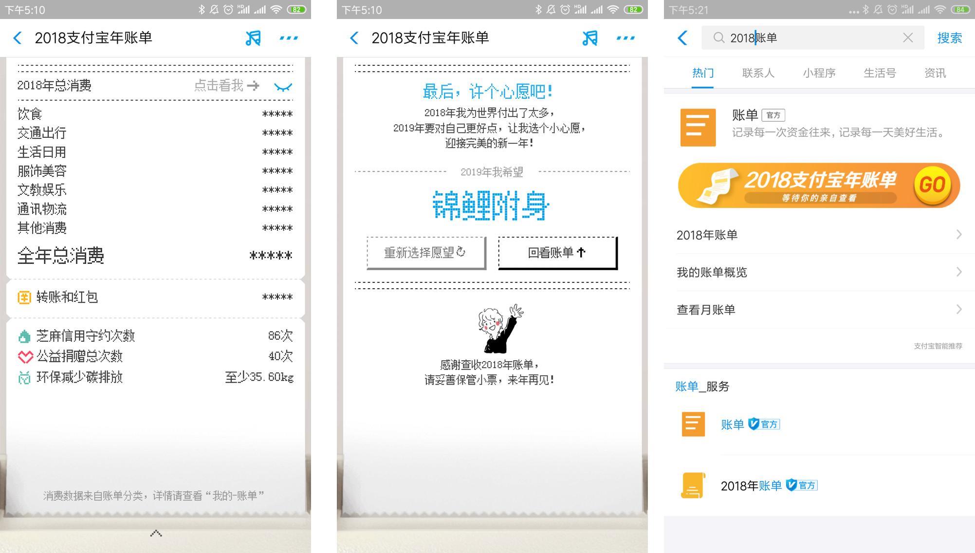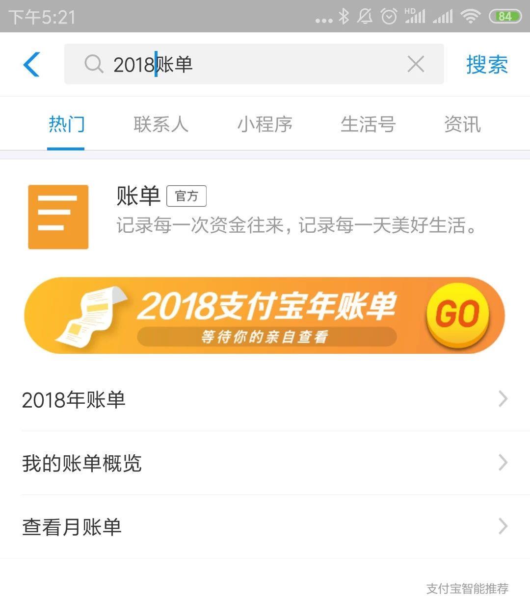 如果你还不知道查询账单的入口,直接在支付宝搜索框搜索 "2018 年账单"即可