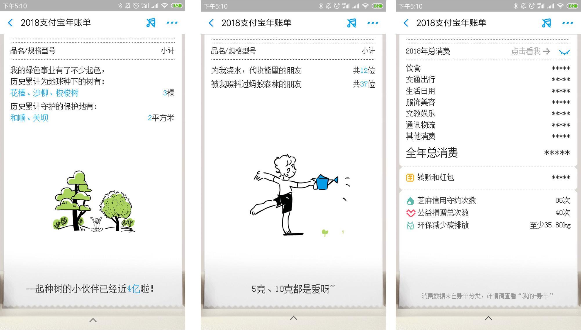 ▲ 蚂蚁森林使用情况;蚂蚁森林互动情况;账单总结