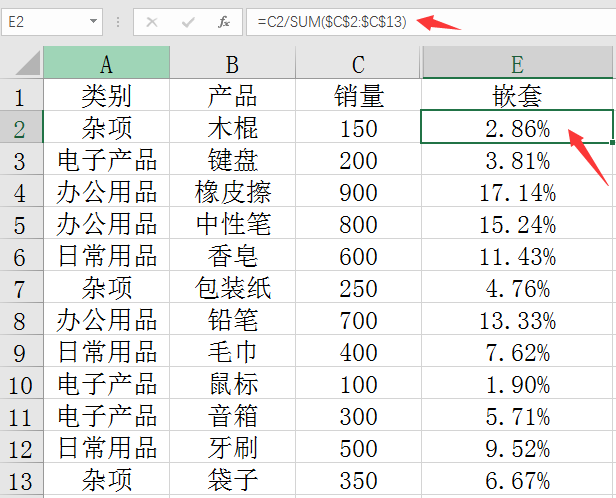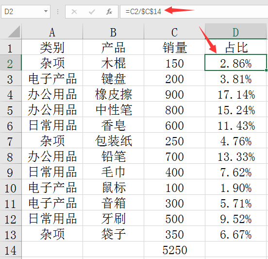 再做个除法,注意绝对引用的锁定,=C2/$C$14,快速得到单品占比。