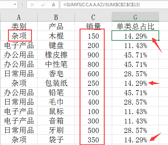 我们来计算单项单类占比,即橡皮擦销量在办公用品中的占比,=C2/SUMIFS(C:C,A:A,A2),SUMIFS求和汇总类别的销量,再计算占比。