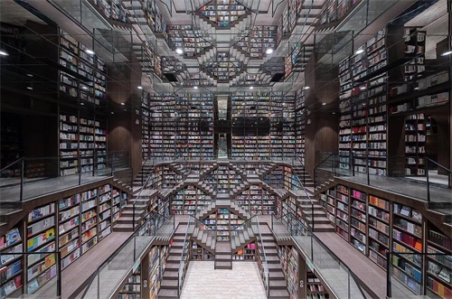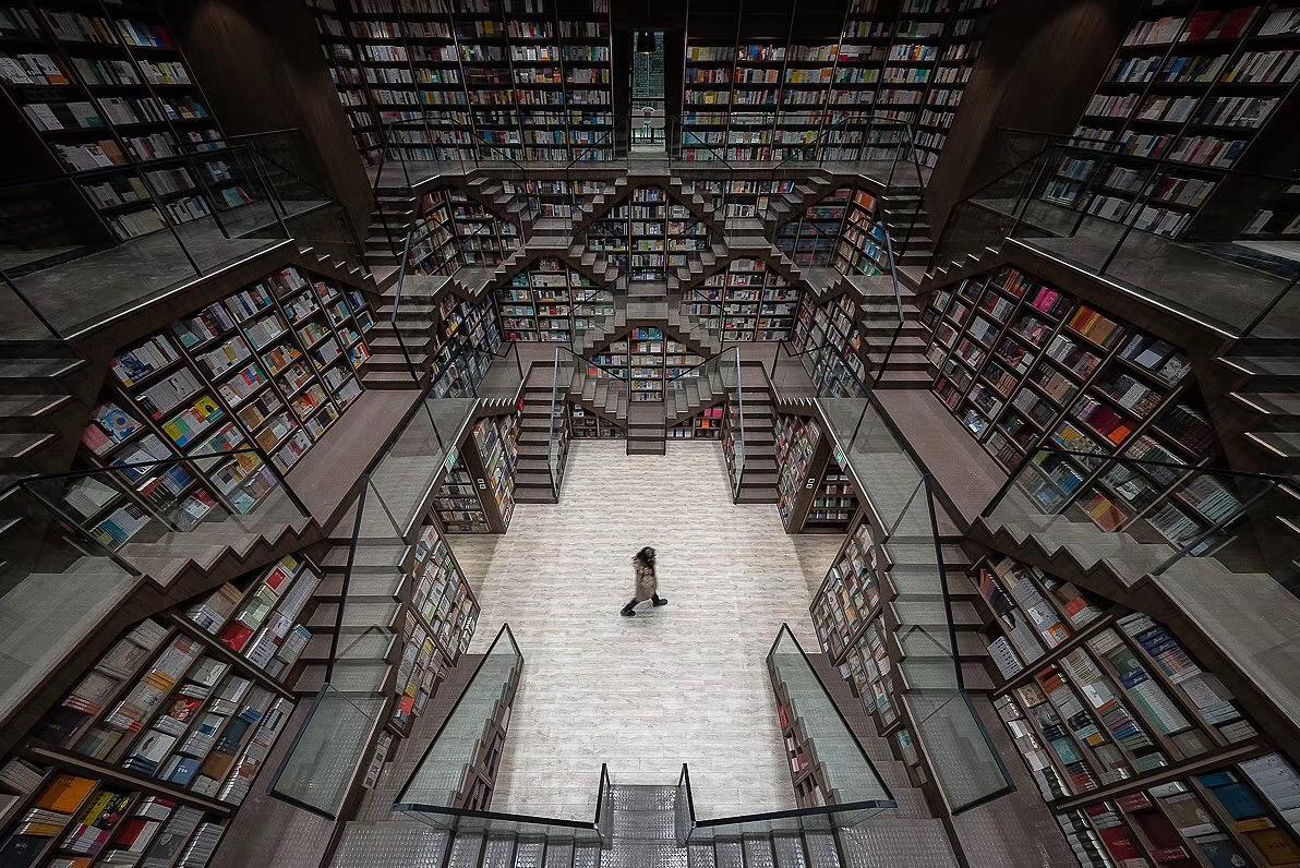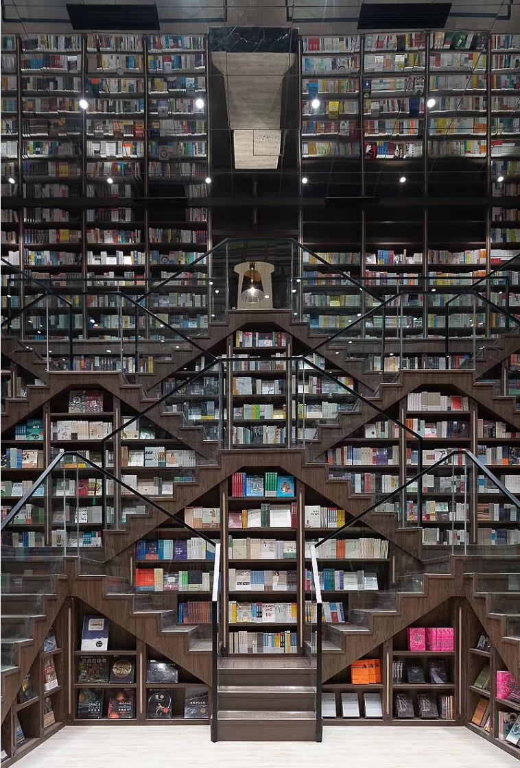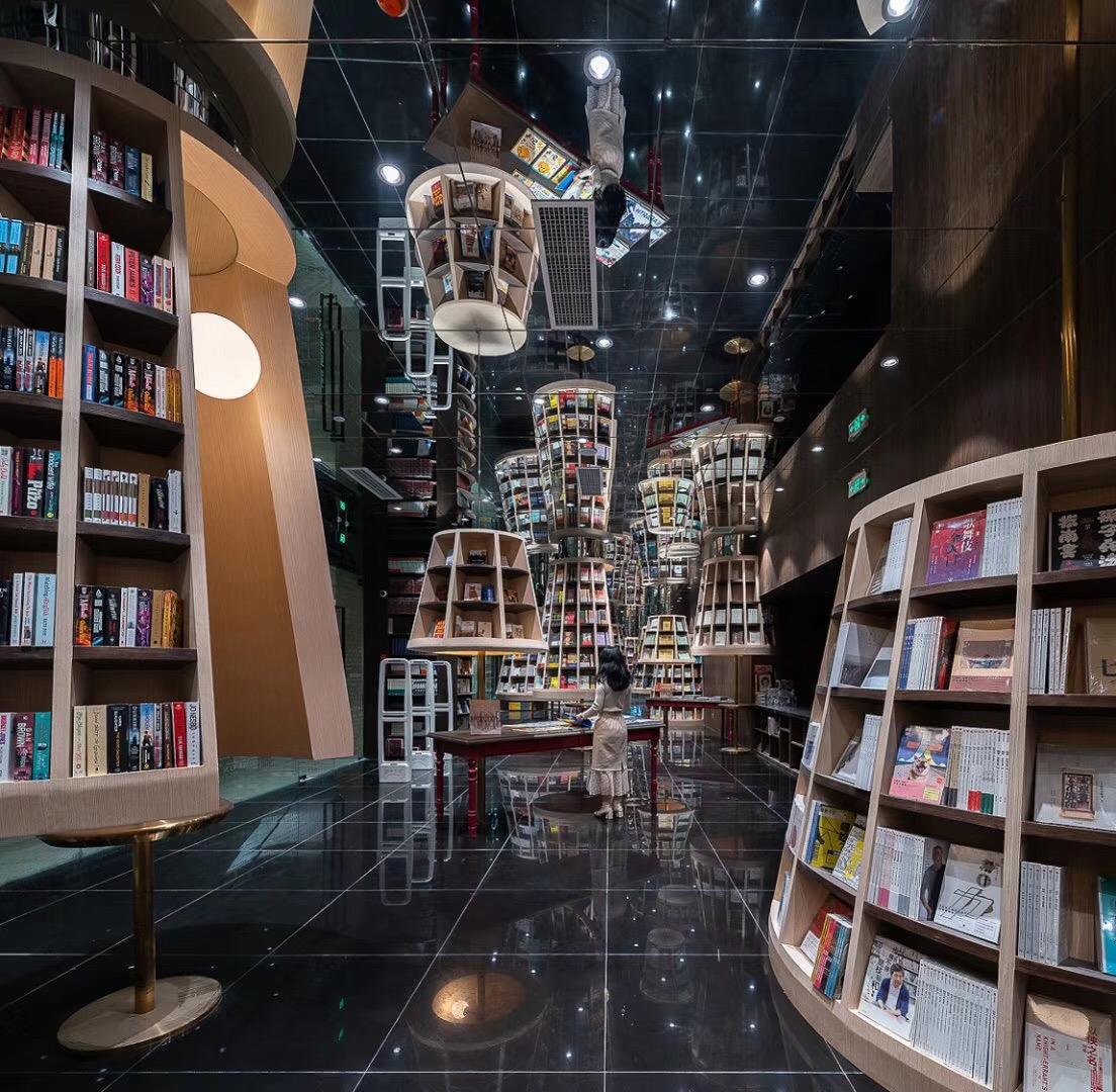 离开儿童绘本区便进入了阅读大厅。钟书阁独具特色的“阶梯讲堂”也被移植进了重庆店中。有别于梯田和山丘的灵感,重庆店的“山形阶梯”更多了几分“绚丽魔幻”的色彩,仿佛千与千寻中的瑰丽场景在此重现。镜面天花倒映着层层环绕的阶梯,展现出一个亦真亦幻的镜像空间。