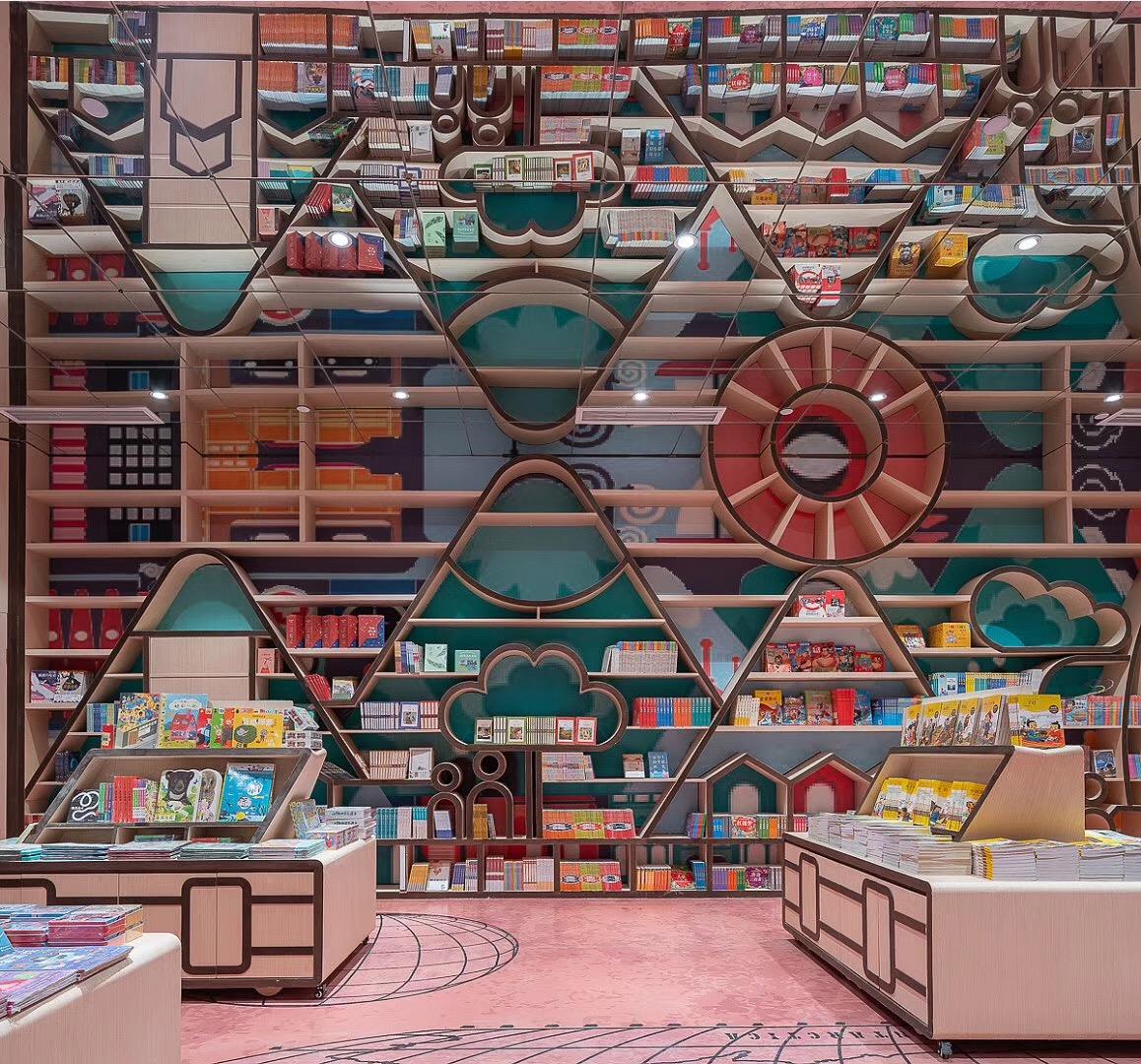 儿童绘本区坐落在书房另一角,绚烂的色彩和充满童真的设计元素则与其他区域产生了明显的区隔。设计师将重庆独有的山城、建筑、交通景观以及宇宙浩瀚都微缩进绘本区内,用斑斓的色彩和夸张抽象的变形赋予其浓郁的童趣色彩。