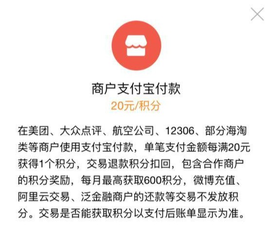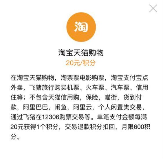 某宝某猫、某票票,某宝支付宝点外卖,某猪购买机票、火车票、汽车票、信用住等,单笔支付每满20元可获得1个积分,月限600分。