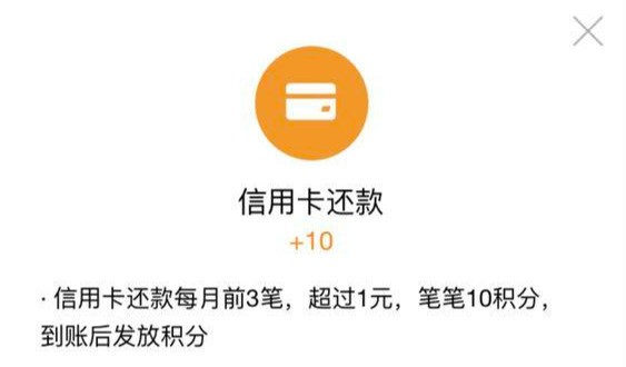 支付宝信用卡还款每月前3笔,每笔实付超过1元,每笔10 积分。