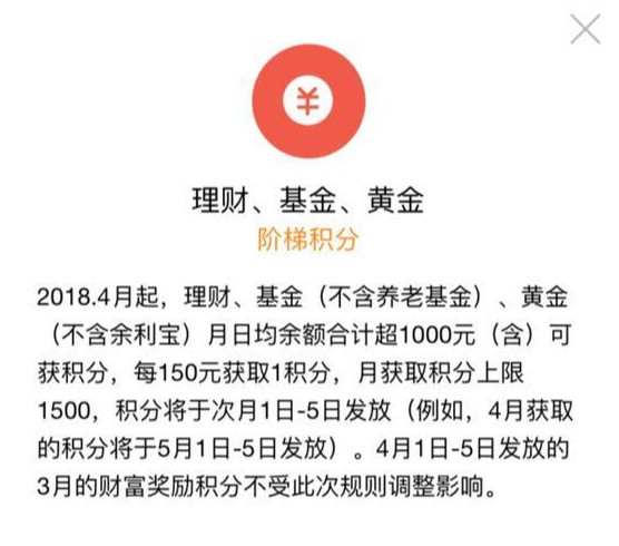 支付宝理财、基金、黄金月日均余额合计超过1000元(含),每150元获取1积分,月限1500分。