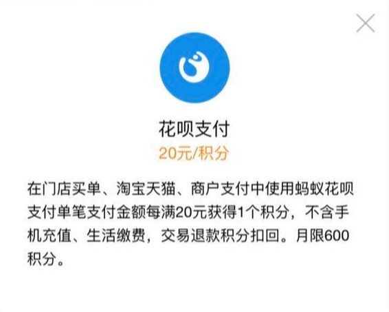 用花呗单笔支付每满20元可获得1个积分,月限600分。