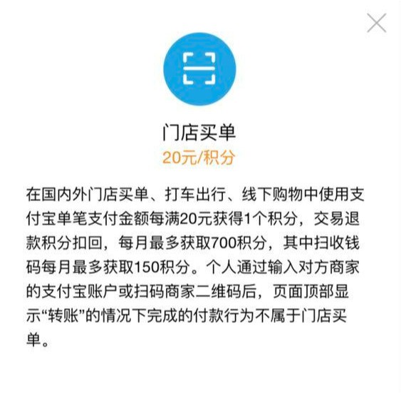国内外门店买单、带车出行、线下购物使用支付宝,单笔支付每满20元可获得1个积分,月限700分,其中扫收钱码月限150分。