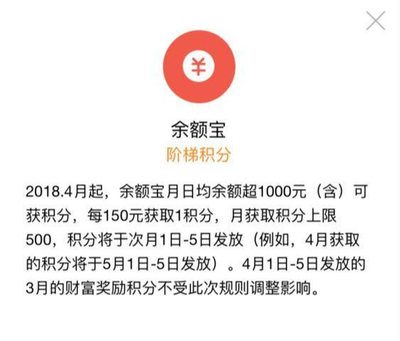支付宝余额宝月日均余额合计超过1000元(含),每150元获取1积分,月限500分。