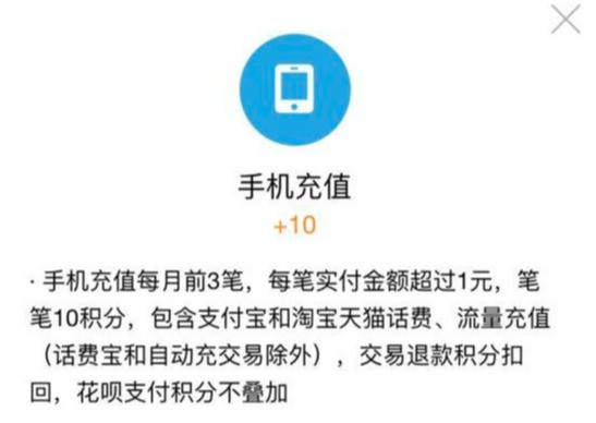 支付宝、某宝某猫手机充值话费、流量,每月前3笔,每笔实付超过1元,每笔10 积分。