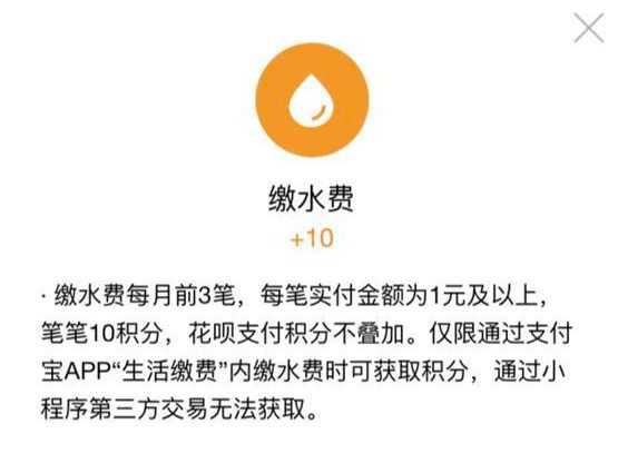 支付宝缴水费每月前3笔,每笔实付超过1元,每笔10 积分。