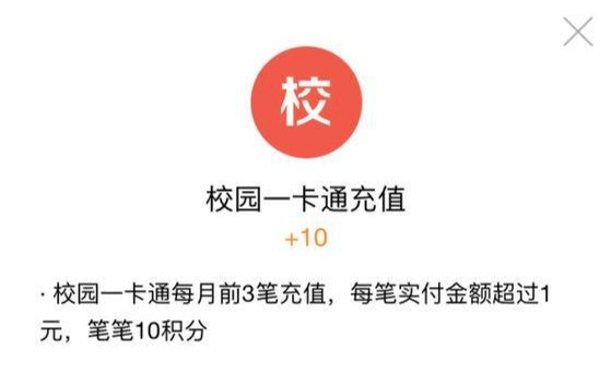 支付宝校园一卡通每月前3笔重启,每笔实付超过1元,每笔10 积分。