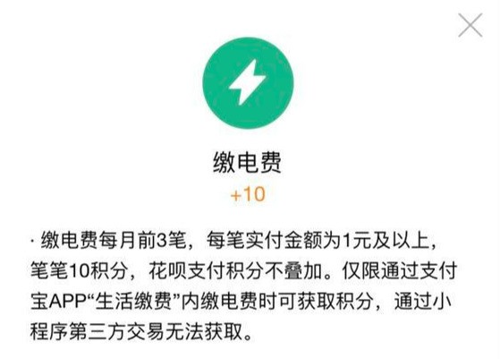 支付宝缴电费每月前3笔,每笔实付超过1元,每笔10 积分。