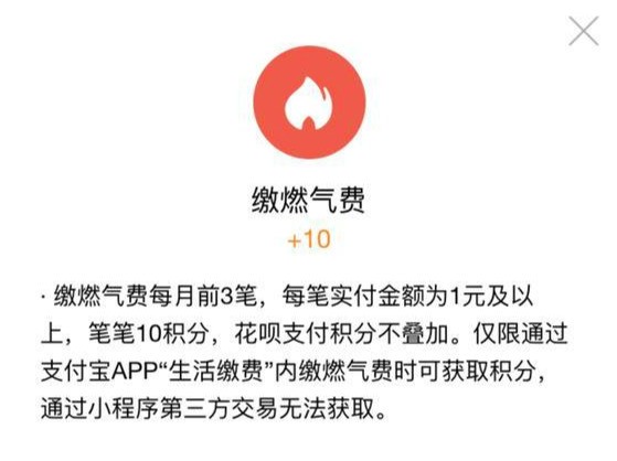 支付宝缴燃气费每月前3笔,每笔实付超过1元,每笔10 积分。