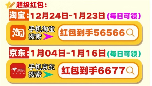 各位网购小能手们,你们知道吗?2025年的年货节那可是超级有料呢!先说说淘宝天猫,它们的年货节从1月4日开始,一直到1月16日才结束。这期间啊,日常红包优惠就像下饺子似的,而且还时不时来个额外加码的红包,这红包呢,面额3 - 5元起。每天晚上8点就像抢宝一样,搜索“红包到手56566”就能领红包。这里面活动亮点可不少,跨店满减,每满200就减30,不用凑单,直接减,多爽啊。下面一起来看看吧: