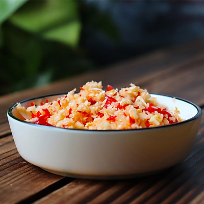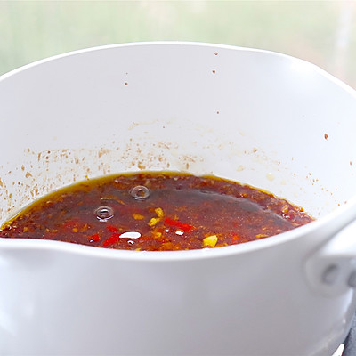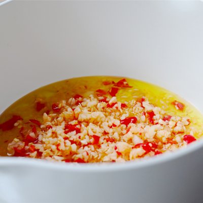 3、锅中放油,放入切碎的大蒜和小米椒,小火熬3分钟;