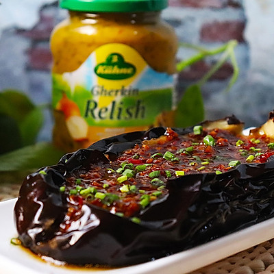 茄子 1个 蒜末 20克 孜然粉 1勺 冠利芥末青瓜蓉汉堡酱 1勺 辣椒粉 1勺 生抽 2勺