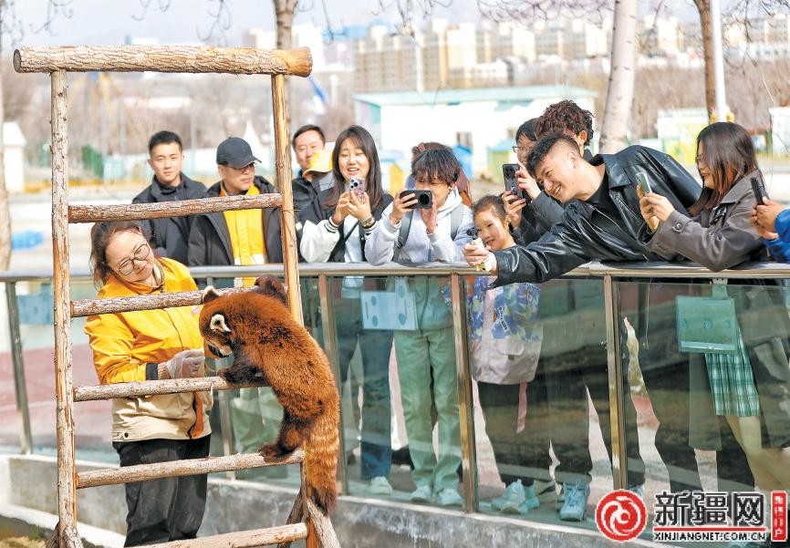 在水上乐园欢乐世界,游客观看小浣熊和饲养员互动。(全媒体记者迪丽娜尔·加力肯摄)