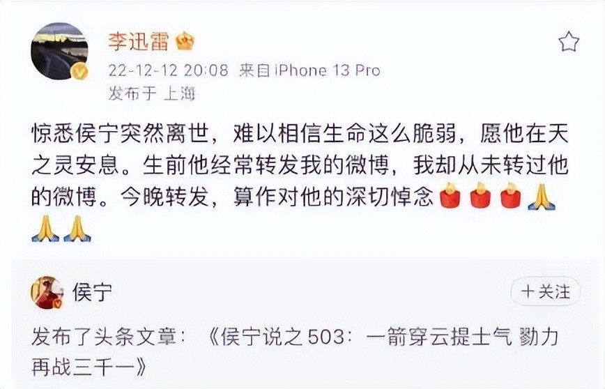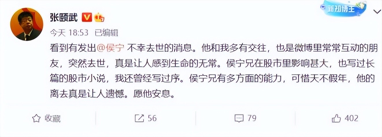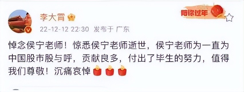对于侯宁的猝然离世,网友是深刻悼念的。不少网友表示,自己是看着侯宁的微博长大的,称其在社交媒体上非常活跃,在股市很有影响力。北大教授、博导张颐武老师发微博表达了追思之意。管清友、李大霄、李迅雷等纷纷表达哀悼。