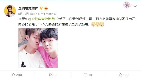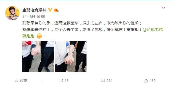 大家都知道,某鹅电竞的两位主播韩跑跑和耀神可谓是一对CP感满满的好基友,跑跑说要带耀神吃遍天下的山珍海味,而耀神也在微博上大秀两人的牵手照片。