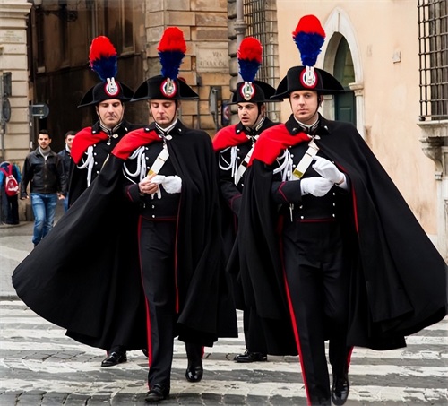 图为意大利宪兵的军装照,他们的军装看上去很绅士,他们的军装颜色也主要以黑色为主,外面的披风看上去也很威武!