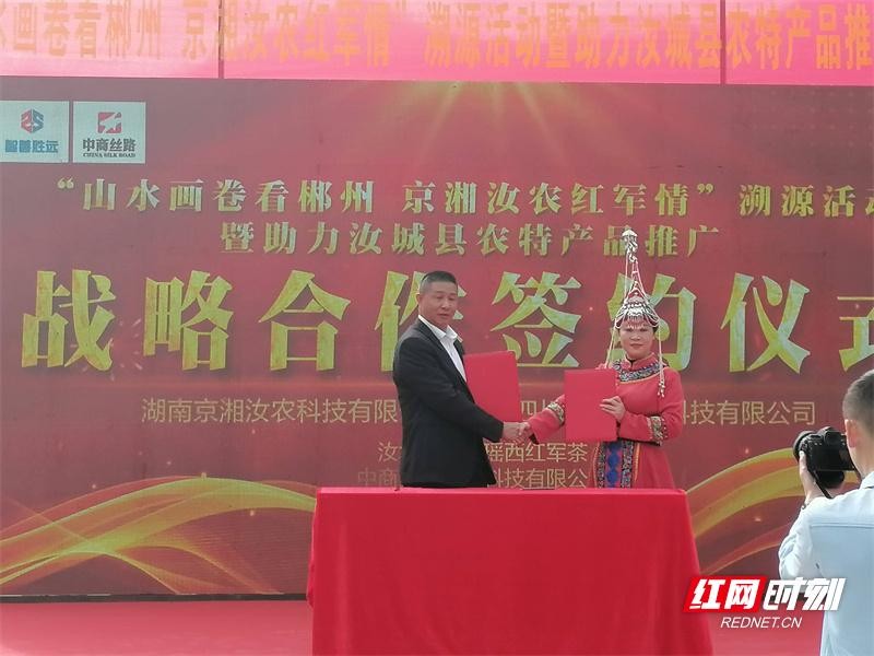 活动中,四川智善胜远科技有限公司与湖南京湘汝农科技有限公司正式签订了战略合作协议,并现场定购旱塘瑶西红军茶2吨及其他农副产品,总价值达1200多万元。此后,将借助四川智善胜远科技有限公司在国内的1000多家门店、100多万会员的私域流量,为汝城的红军茶、汝城辣椒、汝城糍粑等优质农特产品走出郴州保驾护航,开启它们走向更广阔市场的新征程,这也将有力地推动当地乡村振兴工作迈向新台阶。
