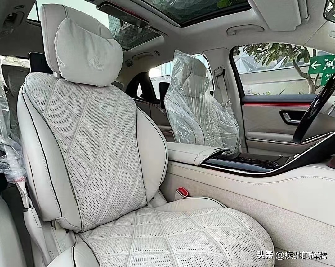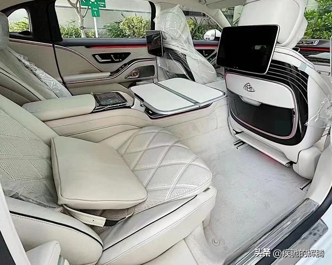 内饰方面,主要以玛奇朵米色皮质为主,前排和S480,S580差别不大,都是12.3英寸全液晶仪表盘和12.8英寸OLED曲面中控屏,64色环境氛围灯,主要差别在于其标配31个扬声器的柏林之声音响,后排配备了头等舱级后排独立座椅,带V12标志的天鹅绒脚垫,后排电话装置,后排折叠桌,冷藏箱等……得益于近3米4的轴距,后排空间巨大,座椅大却不塌,这就是迈巴赫的逼格。