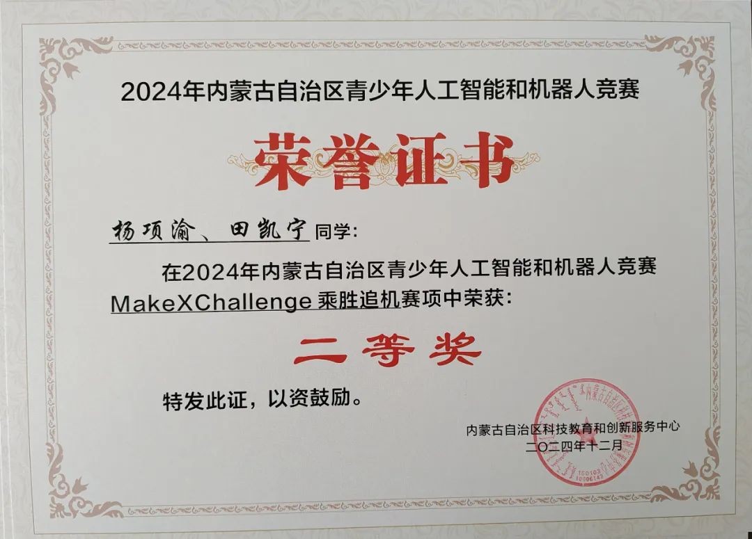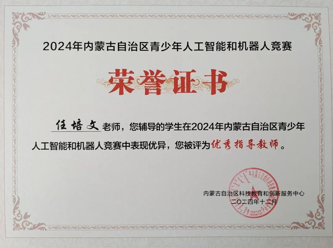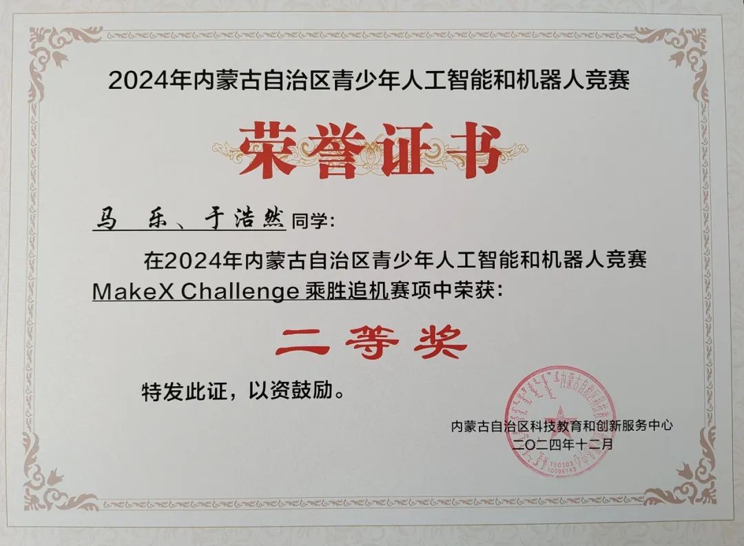 近日,内蒙古自治区第四届中小学生人工智能及创客教育创新实践竞赛活动获奖结果公布,准旗一中代表队获得了MakeX Challenge乘胜追击赛项团体两项二等奖,任培文老师荣获优秀指导教师荣誉称号。