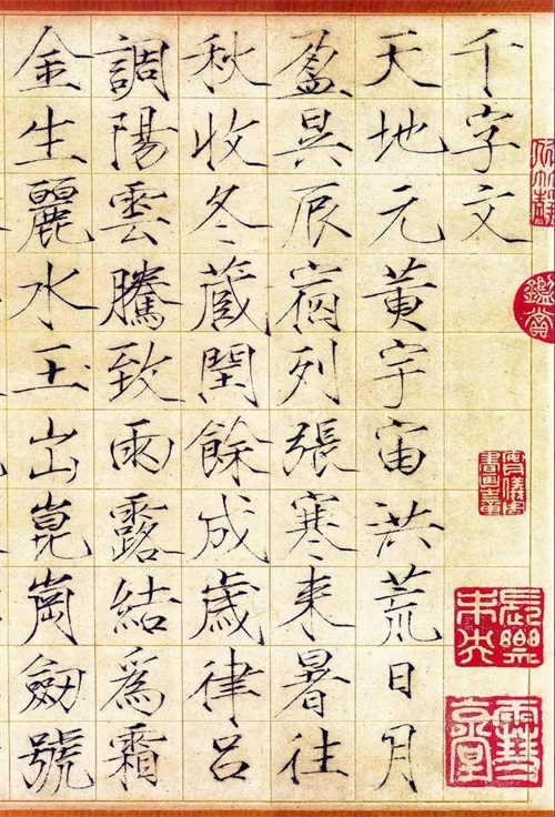 - 《楷书千字文》:赵佶23岁时写给大臣童贯的作品,此时瘦金体已初具风格,用笔源自褚遂良、薛稷,结体和笔势取自黄庭坚大字楷书,舒展劲挺。