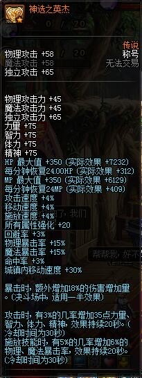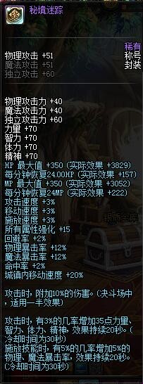 属性:力量智力体力精神+70、物理攻击力魔法攻击力+30、独立攻击力+60、物理暴击魔法暴击+12%、所有属性强化+15、攻击速度施放速度移动速度+3%、命中率回避率+2%、HP最大值MP最大值+350、HPMP每分钟恢复24、城镇内移动速度+20%、攻击时附加10%的伤害(决斗场以1/2的概率触发)、攻击时有3%的几率增加25点力量智力体力精神,效果持续20秒(冷却时间30秒)、施放技能时,有5%的几率增加5%的物理魔法暴击,效果持续20秒(冷却时间30,秒);