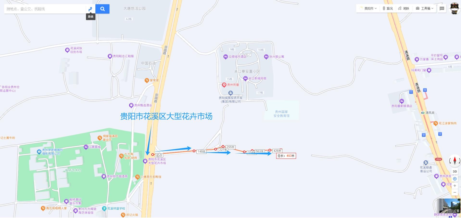 注:导航定位至贵阳市花溪区大型花卉市场后,按图前行445米即可到达。