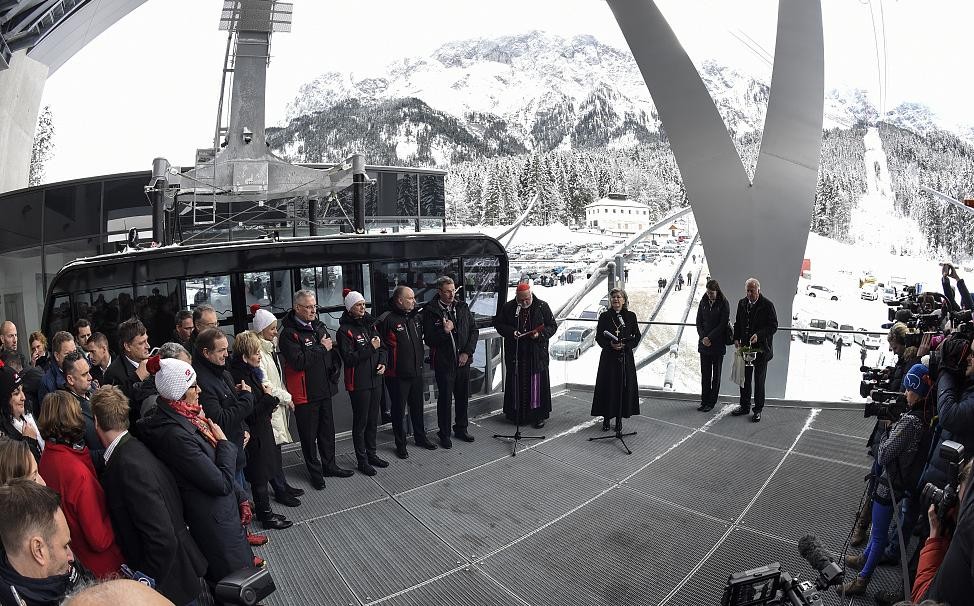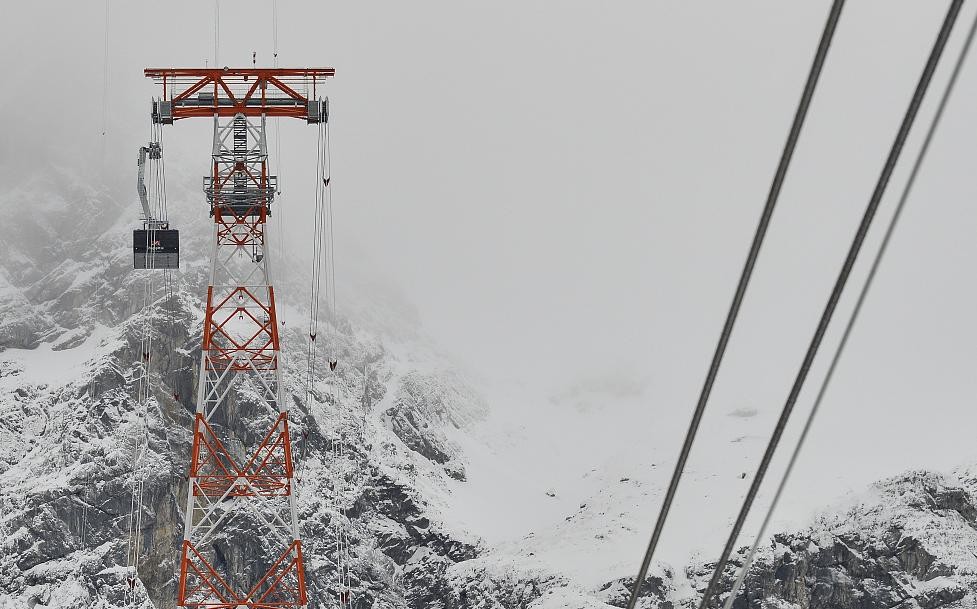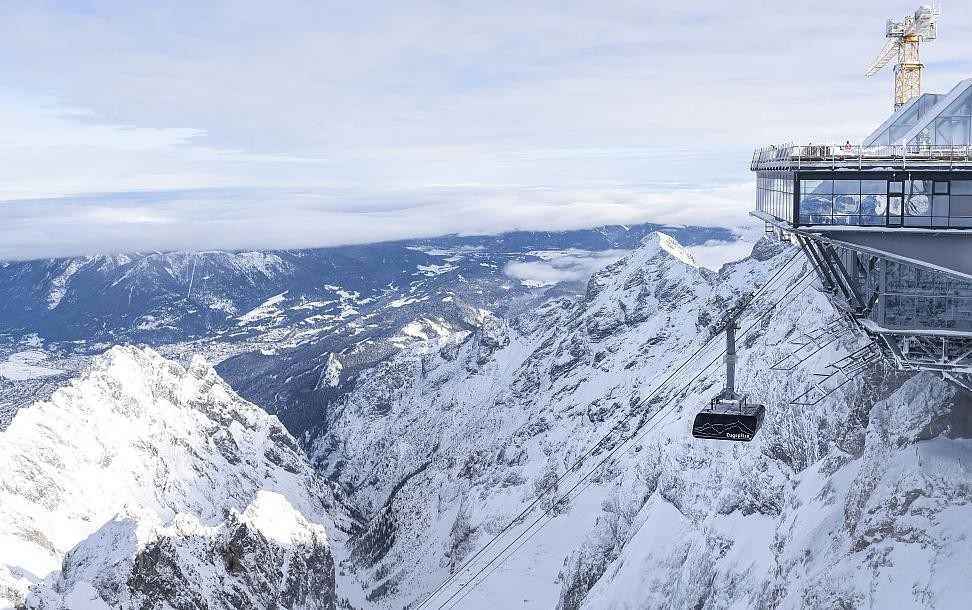 当地时间2017年12月21日,德国巴伐利亚州格赖瑙,德国第一高峰——楚格峰的新索道正式启用。新索道创3项世界纪录:127米钢结构柱支撑、立柱到缆车停靠站距离3213米、1945米的海拔差。新索道系统每小时将580人送向山顶。