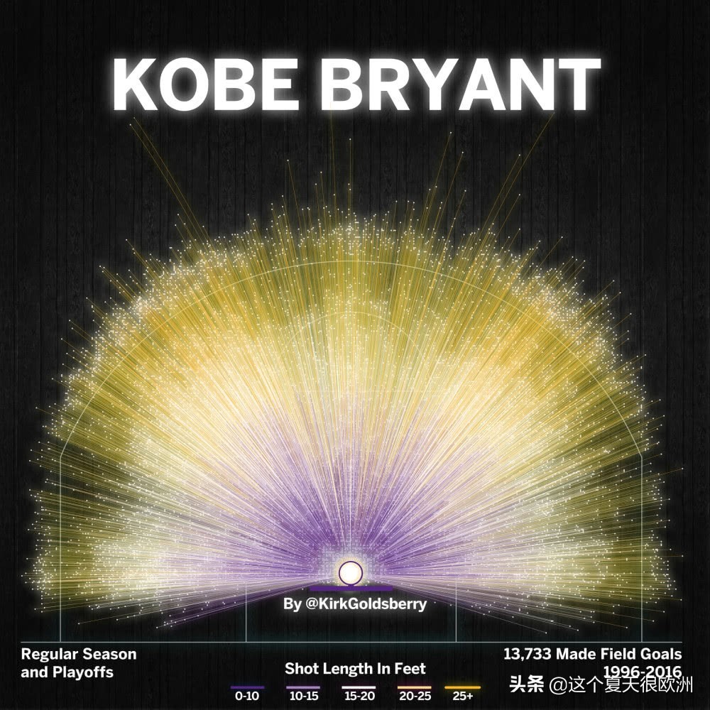 此外这位投篮图的绘制者最让人感激的一点是,他整个图对于到篮筐距离的远近选用了紫色到黄色的过度,这恰恰就是科比紫金一生的缩写。而整个科比的投篮命中图以放射状的铺开,绚烂夺目,1万余次投篮点像极了宇宙中的星辰大海,也像极了燃尽生命的力量给人美好的烟花。