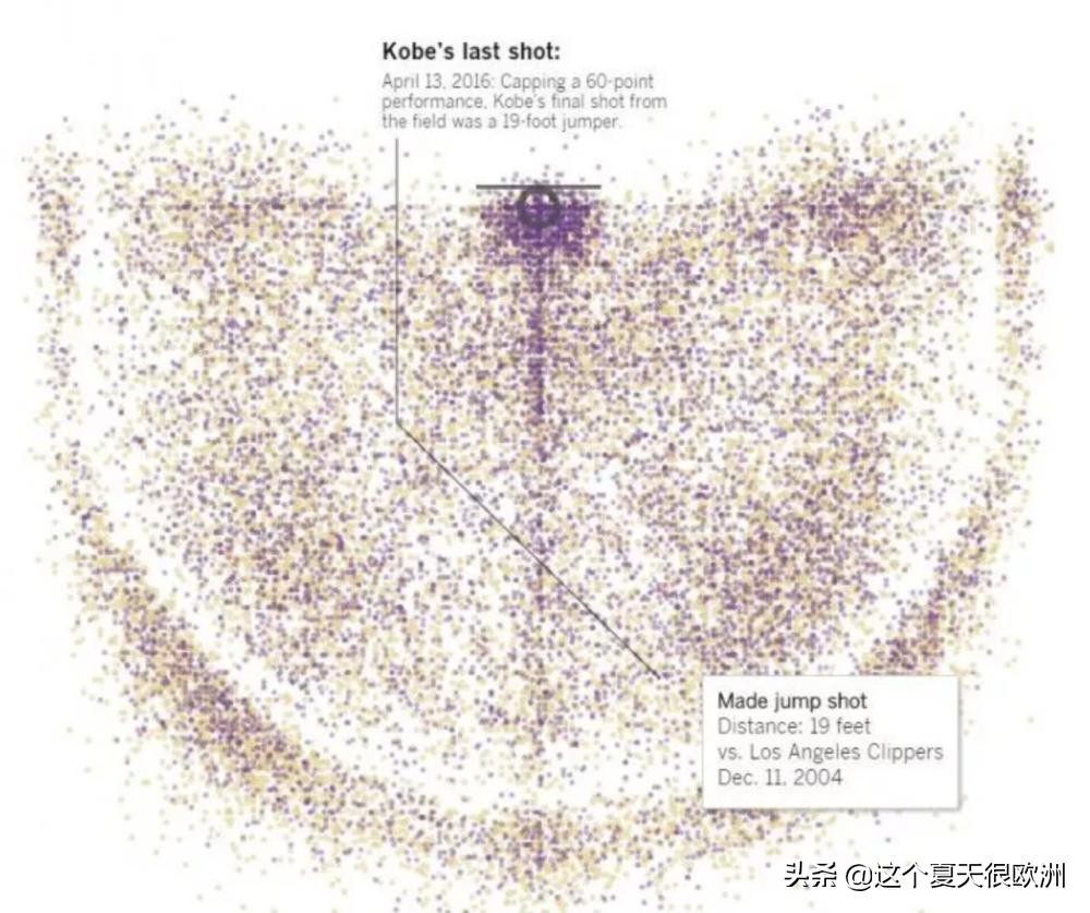 在科比20年的NBA职业生涯一共命中了13733记投篮,通过这张图可以看到,他的命中球的投篮点覆盖了几乎整个篮球半场。从负角度到中圈,可以看出他对胜利的偏执与疯狂。下图是科比NBA生涯最后一次投进的那记球,那场比赛他拿到了60分,也是他NBA生涯的终点。
