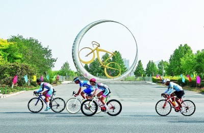 5月24日至26日,2024年河北省青少年公路自行车赛在河北平乡举办,比赛共设男女4个组别10个项目,来自河北省10个地级市的130余名运动员参加比赛。图为26日,参赛选手从河北省邢台市平乡县自行车主题公园雕塑前经过。柴更利摄/光明图片