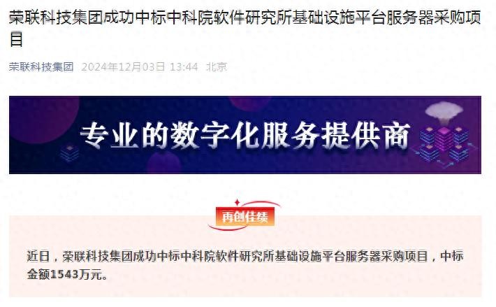 荣联科技集团中标中科院软件研究所基础设施平台服务器采购项目