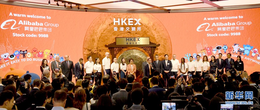 11月26日在香港交易所拍摄的挂牌上市仪式现场。 当日,阿里巴巴集团控股有限公司(阿里)正式在香港交易所挂牌上市,成为首个同时在美股和港股两地上市的中国互联网公司。 新华社记者 朱祥 摄