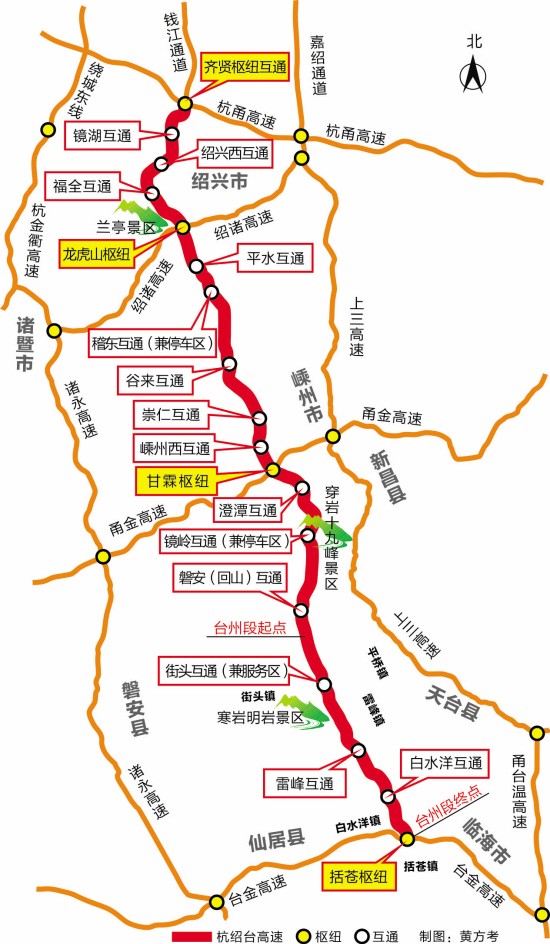 台州境内有街头互通(兼服务区)、雷峰互通、白水洋互通及括苍枢纽,路线全长45.19公里、总投资86.5亿元。建成后,台州到杭州只需2.5小时,力争明年国庆与绍兴段同步通车。