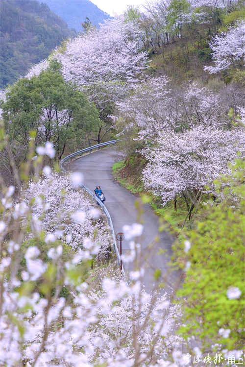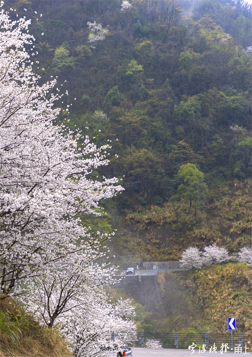 3月17日,宁波晚报记者来到四明大桥,沿途若隐若现的樱花,点缀了山坡和山头。整个山谷被白色樱花装扮得春意盎然。