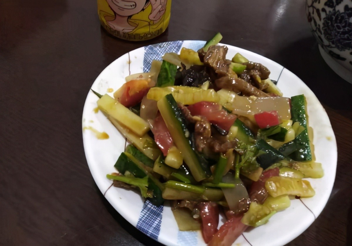 我们还点了他们家的特色凉菜,这一份是潍县辣皮。其实就是普通的凉皮,有所不同的是这份凉皮麻酱汁放得比较多,还放了好多黄瓜、西红柿和木耳。蒜味不是很浓,有点偏甜,比较清爽,像这种清爽小凉菜就适合搭配和乐面。