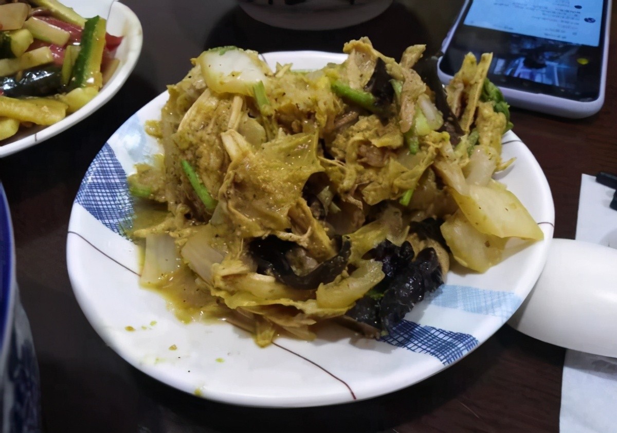 这一份是潍坊的芥末鸡,一听芥末就能感受到那种味道了。潍坊的芥末鸡用的是中国真正的黄芥末,用开水烫开,把煮好的白条鸡,拆骨,一定要用手拆,不能用刀斩开,斩开就没有灵魂了。加上香葱香菜和白菜木耳,最后加上烫好的黄芥末,加醋和酱油,拌匀,就可以装盘上桌了。芥末鸡的味道属于偏辛辣的,刺激程度不亚于青芥辣酱,不喜欢很冲辛辣味道的小伙伴慎重选择哦,因为会泪流满面,感动到哭。但是如果你慢慢适应了它,就会爱上这种味道的,就会感觉得非常的上头,味道一级棒。