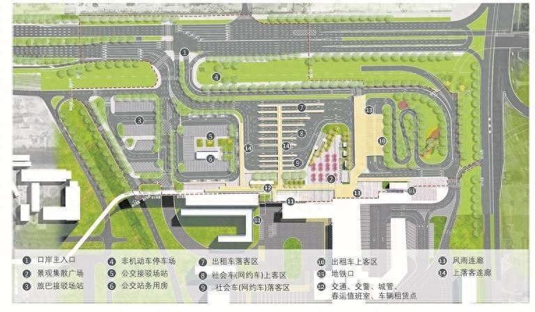 此外,增设全覆盖式风雨连廊衔接人行天桥、落客区、口岸联检大楼及地铁口,建设仿石材砖慢行铺装及生态绿地,提升景观绿化及慢行接驳设施。按临时建筑标准增设公交站房、交警值班室等配套建筑,总面积约400平方米。