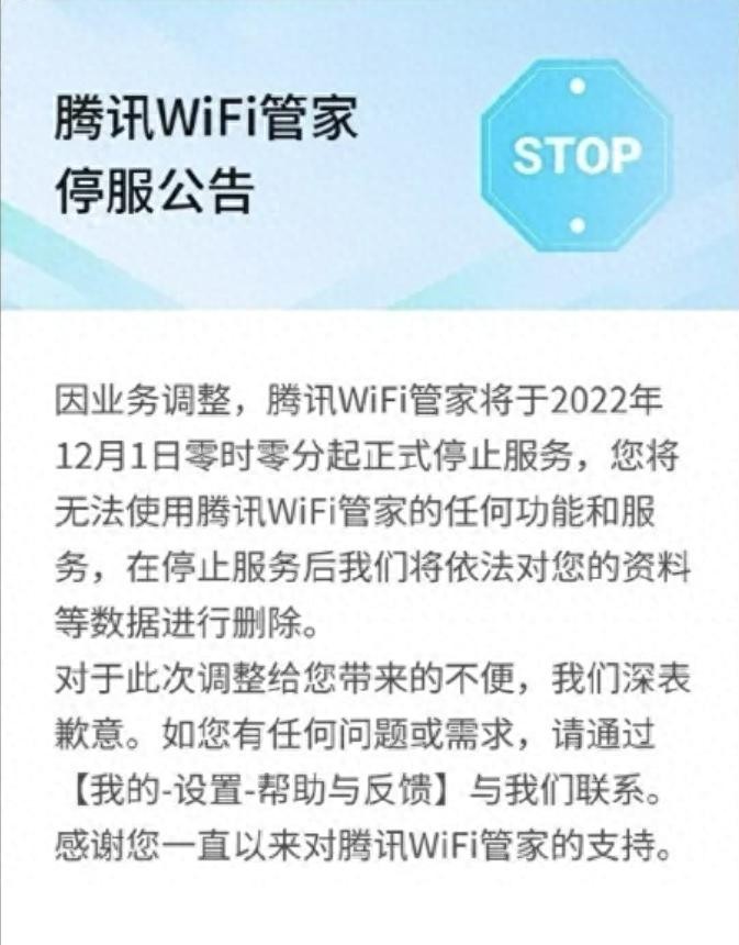 腾讯WiFi管家发布的公告称,因业务调整,腾讯WiFi管家于2022年12月1日零时零分起正式停止服务,用户将无法使用腾讯WiFi管家的任何功能和服务,在停止服务后将依法对用户的资料等数据进行删除。