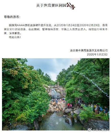 【渔湾景区闭园公告】因渔湾AAAA景区旅游硬件提升改造,从2020年1月24日至2020年2月29日,渔湾景区实行封闭改造,在此期间,暂停接待游客,非施工人员禁止进入。