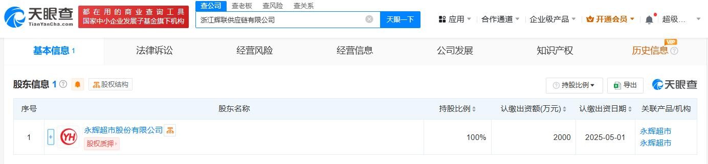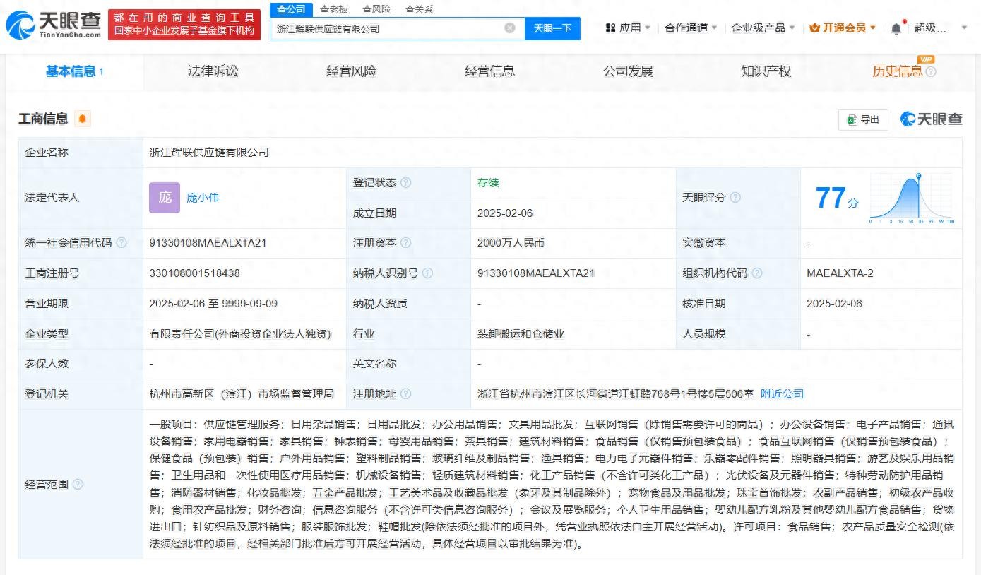 每经AI快讯,天眼查App显示,近日,浙江辉联供应链有限公司成立,法定代表人为庞小伟,注册资本2000万人民币,经营范围包括供应链管理服务、日用杂品销售、日用品批发、互联网销售等,由永辉超市(601933)全资持股。