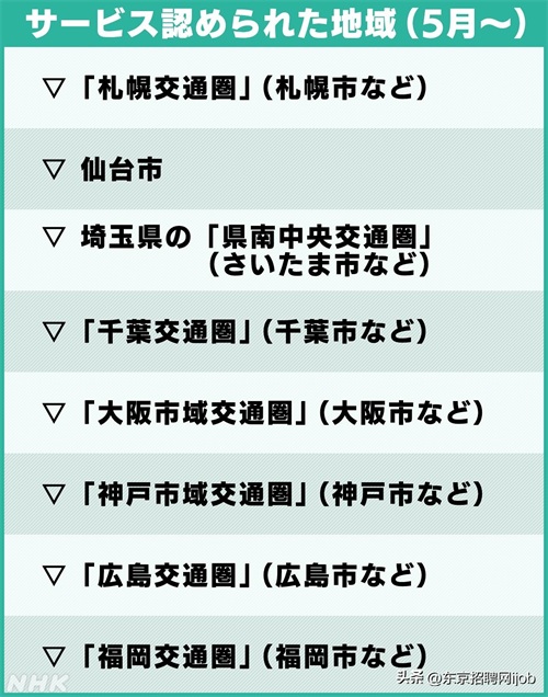 5月开始札幌、仙台市、县南中央交通圈(埼玉市等)、千叶、大阪市域、神户市域、广岛、福冈8个地区也允许拼车,一共开放了11个区域,预计未来提供服务的区域将会扩大。