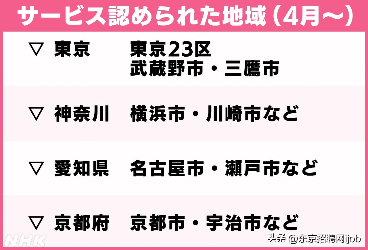 目前除了东京都开放东京23区、武藏野市、三鹰市之外,国土交通省还批准了京滨(横滨市等)、名古屋、京都市域等地,4月内开始提供私家车载客;