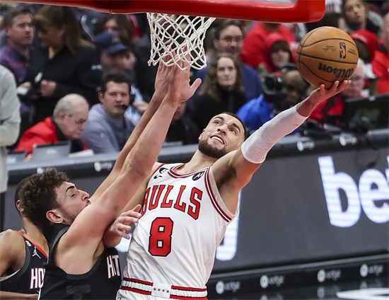 12月26日,公牛队球员拉文(右)在比赛中上篮。 新华社发(乔尔·莱纳摄)