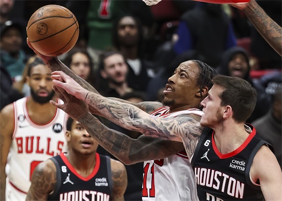 12月26日,公牛队球员德罗赞(右二)在比赛中上篮。 新华社发(乔尔·莱纳摄)
