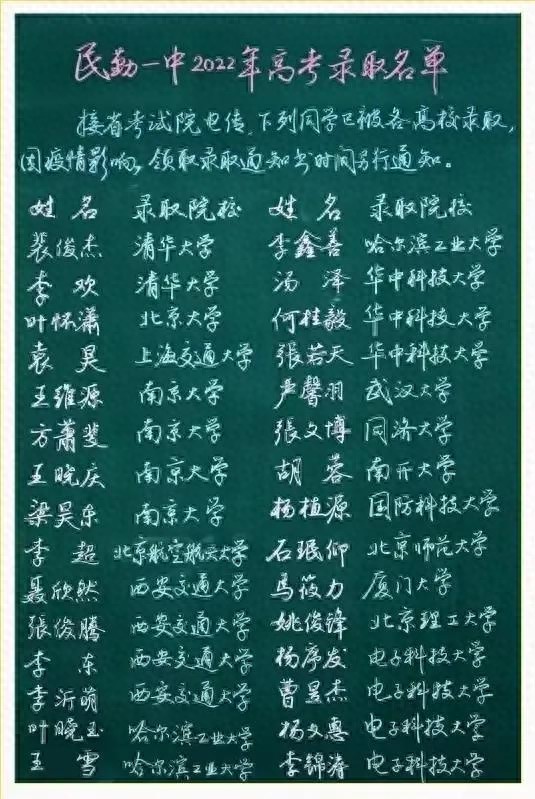 陇原名校民勤一中在2022年的全国高考中再创辉煌,在全省众多中学中,民勤一中取得了令人瞩目的优异成绩,很多优秀学子都被清华、北大等985、211、双一流等国内名校录取。在全县学生大幅减少、中考后很多尖子生被西北师大附中、兰州一中和武威一中等中学拔走后,民勤一中还能取得这样的优异成绩,确实难能可贵。这与广大课任老师和所有同学的辛勤付出和刻苦努力密不可分。多少个日日夜夜、多少个严寒酷暑,都有一中老师们在讲台上反复讲解,他们苦口婆心、孜孜不倦。粉笔染白了他们的双鬓、岁月压弯了他们的腰板。可他们总是没有怨言,每天继续着他们的坚守。同学们更是头悬梁,锥刺股,早起晚睡,刻苦努力。校园的林荫道上,到处能听到同学们朗朗的读书声,灯火通明的教室里,传出的是笔尖刷题的“沙沙”声。他们付出了常人没法付出的努力,吃过了常人没吃过的苦,最终天不负人,不负众望,这样的成绩在全省都是名列前茅的,祝愿母校今后的岁月中再接再厉,再创佳绩!